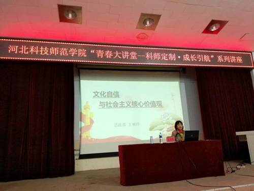 4月—5月初,由学校党委学工部、校团委主办的“青春大讲堂—科师定制˙成长引航”社会主义核心价值观类主题讲座分别在三个校区开展,我部教师马爱林、李建忠、王丽玲、王炳义分别以《从意识形态角度谈社会主义核心价值观》、《牢记使命,做社会主义核心价值观的践行者和引领者》、《文化自信与社会主义核心价值观》、《践行社会主义核心价值观做当代合格大学生》为题,在全校开展了共计12场宣讲活动,共有4100余名学生聆听了讲座。