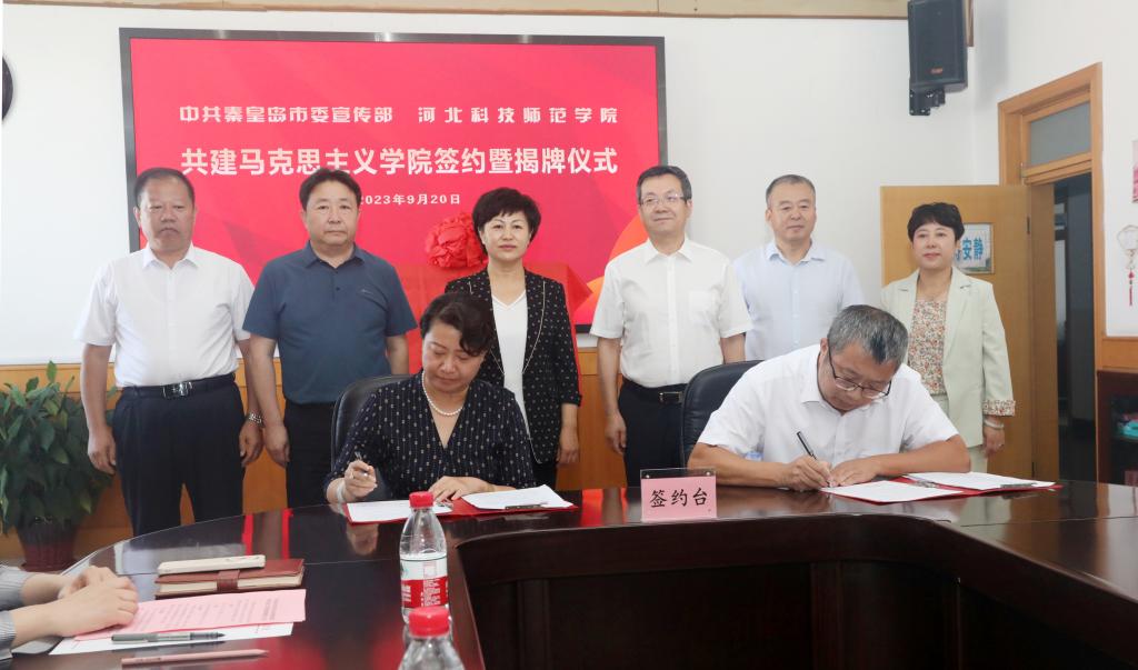 为深入贯彻习近平总书记在学校思想政治理论课教师座谈会上的重要讲话精神,贯彻中央、省委关于思政课改革创新重要意见,落实秦皇岛市委相关部署,充分发挥秦皇岛市委宣传部政治领导优势及地方资源优势和Beat365官网教育资源优势,提升Beat365官网Beat365官方网站建设水平,推进秦皇岛市学校思想政治理论课改革创新,更好服务秦皇岛地方经济社会发展,2023年9月20日上午,Beat365官网与中共秦皇岛市委宣传部共建Beat365官方网站签约暨揭牌仪式在逸夫教学楼1116会议室隆重举行。中共秦皇岛市委常委、宣传部长许红琳,市委宣传部常务副部长、一级调研员郑新,市委办公室、市委党史研究室、市委市直机关工委、市委教育工委、市农业农村局、市旅游文广局、市国资委、市社科联、市日报社、市广播电视台等单位分管领导出席了仪式。Beat365官网党委书记朱勇,党委副书记、校长郭旭涛,党委常委、副校长蒋爱林以及相关职能部门负责人、Beat365官方网站班子成员、教师代表参加了仪式。仪式由Beat365官网郭旭涛主持。